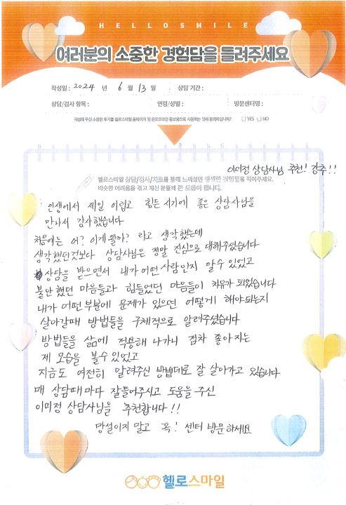 도움을 주신 헬로스마일 상담선생님 추천합니다.